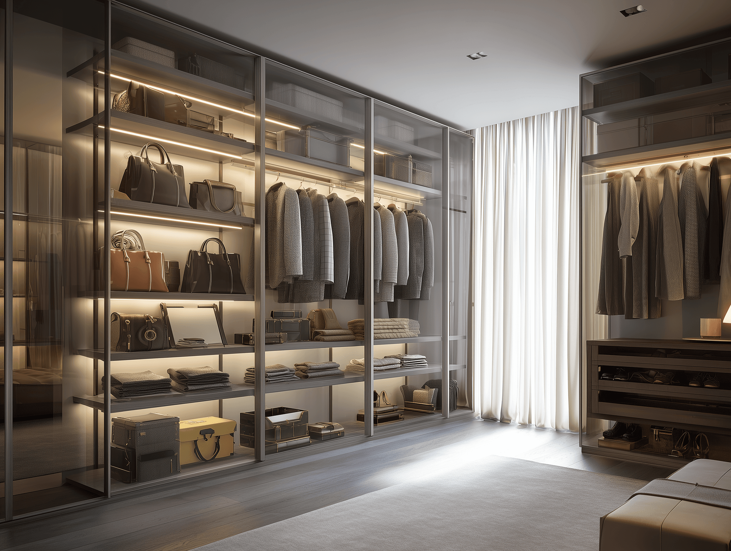Motion-sensing warm LED in every drawer, shelf, and hanging bay. Open the door and the room turns on.